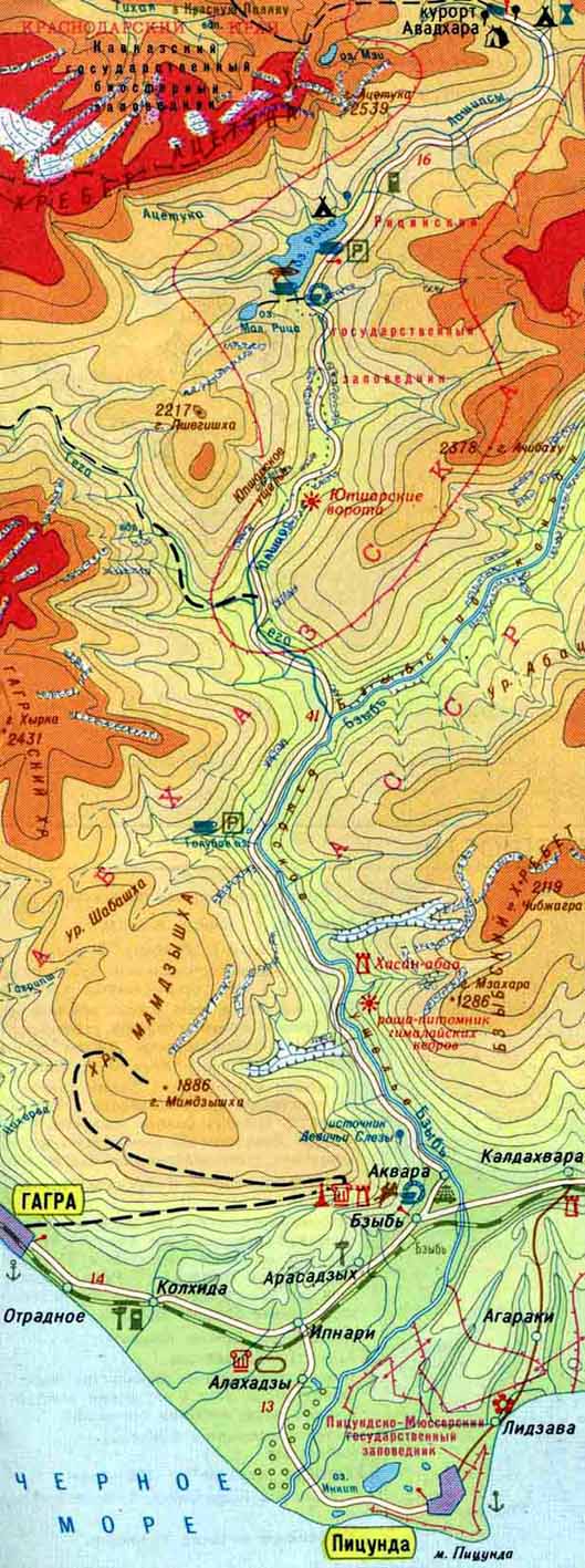 Вторую разведку мы провели во время нашего похода на озеро Рица. Дорога на Рицу проходит по ущельям трех рек: Бзыбь, Гега и Юпшара (карта). Бзыбь – полноводная и быстрая река, течет по широкому ущелью. Когда-то Бзыбь