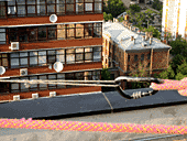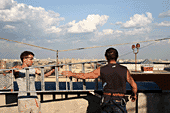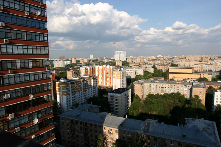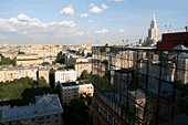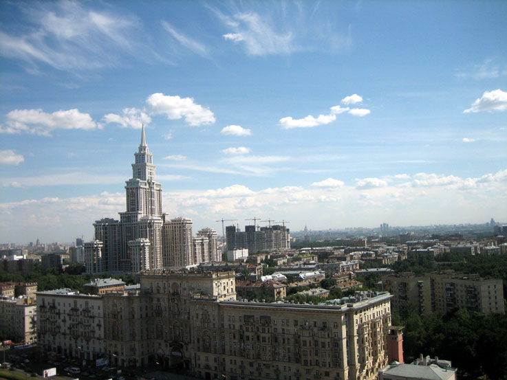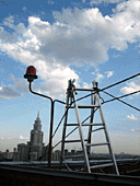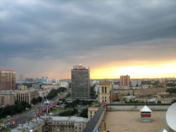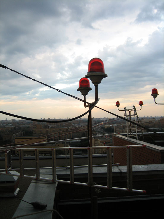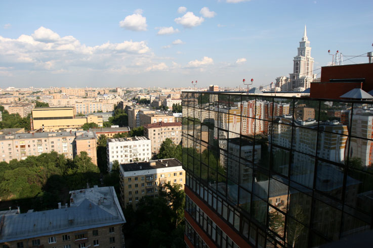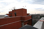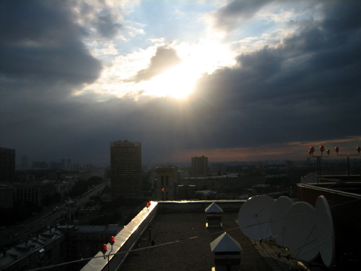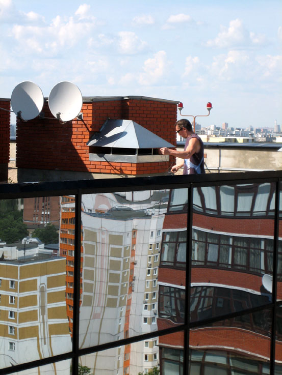 Ситуацию спас звонок Николаю Васильевичу Сулимовскому, который, определив где мы находимся, вновь направил наши стопы к охраннику, а сам при этом приветливо помахал рукой с крыши ближайшей к нам 20-этажки. Вскоре за нами спустился Лешка (Konho) и после бумажной волокиты мы наконец-таки поехали вверх. Пара минут в лифте, подъем по лестнице в обход петнхаусов и мы прибыли на место. Первое что понимаешь, очутившись на крыше – это какой-то внутренний восторг от безграничной свободы вокруг. Ух! И глубоко вдыхаешь в легкие воздух. Здесь, на крыше, можно смотреть в любую сторону света до самого горизонта, почти постоянно дует ветер и над головой только синее небо! Такое же мне доводилось ощущать на фрегате Штандарт – ранним утром взбираешься на грот-марсель-рей ставить паруса, а вокруг только море и небо. Красота!!!