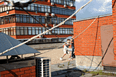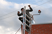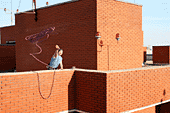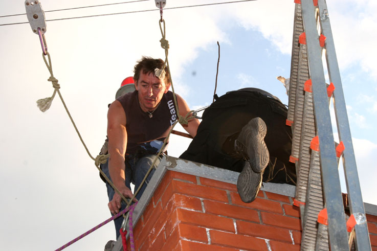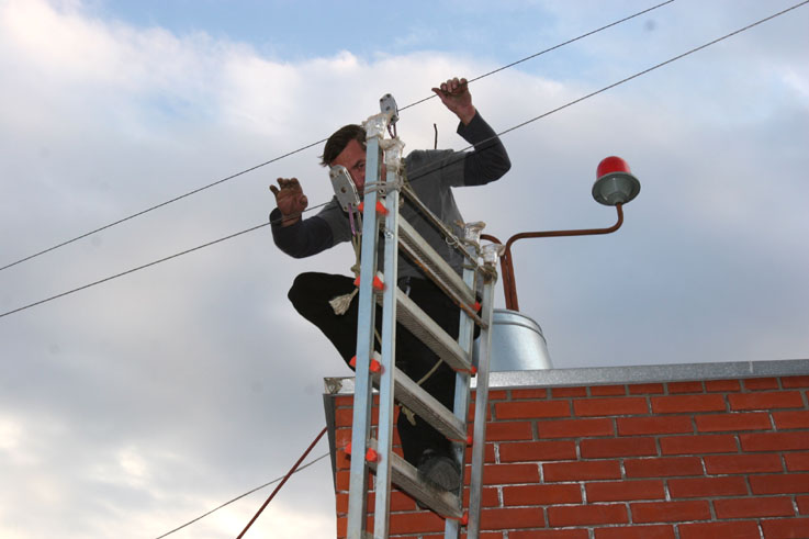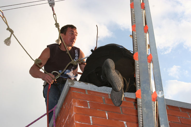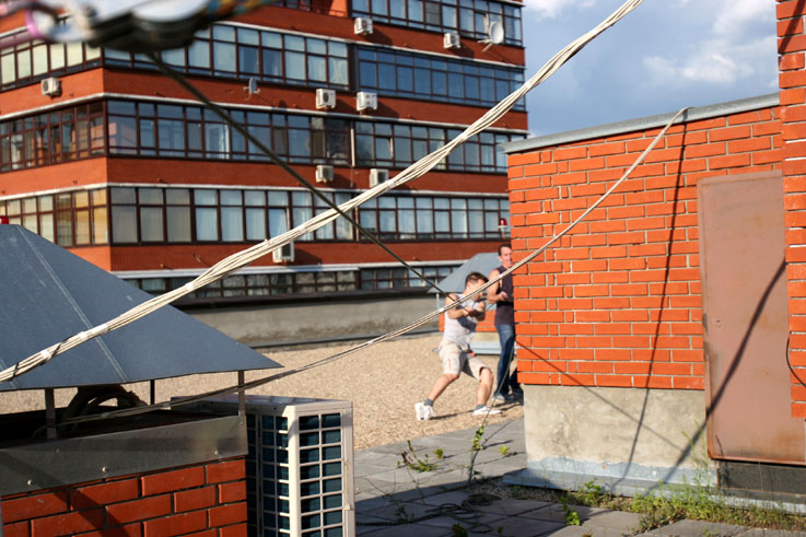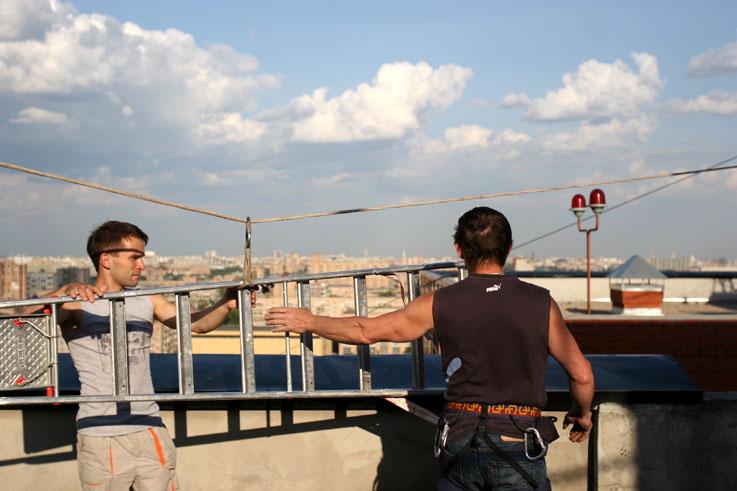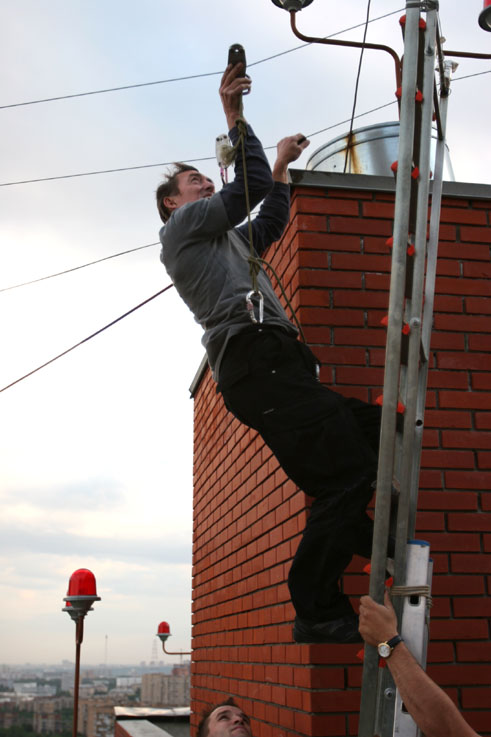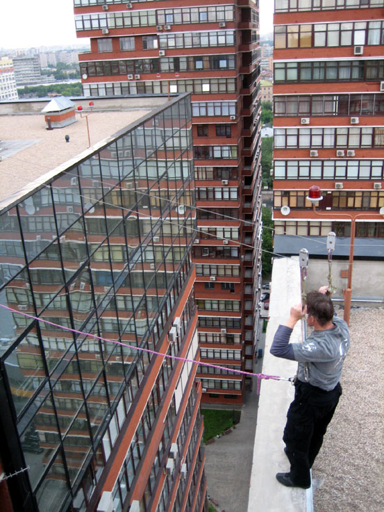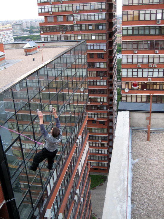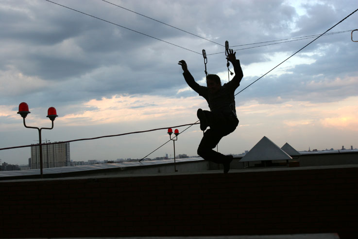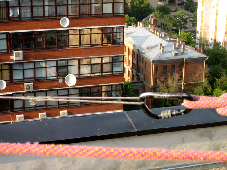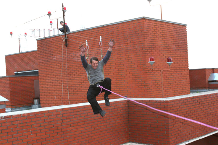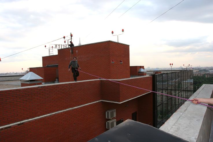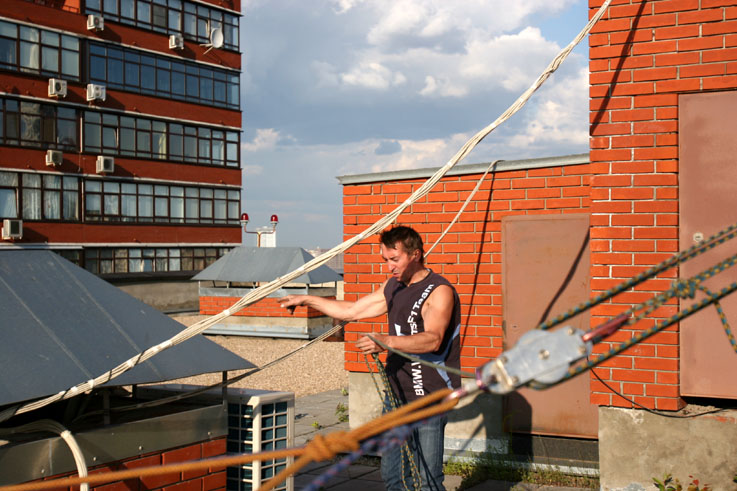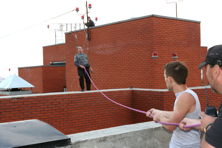 Мои надежды на героический прыжок каскадера на 8-9 метров (именно столько между зданиями) рассеялись как утренняя роса, когда я увидел страховку. Между домами была натянута двойная металлическая проволока, растянутая с концов полиспастами. О прыжке с разбега даже нечего было думать – по периметру крыши был установлен кирпичный ограждающий бордюр, так что прыжок предстоял бутафорский. И хотя от этого предстоящее более безопасным не становилось, я был немного разочарован. В ожидании съемочной группы и крутого паркурщика-каскадера, который должен был воплотить задуманное, наша маленькая команда принялась за доводку страховочной системы. Дело в том, что провис системы под нагрузкой даже в 60 кг был достаточно большим, что уж говорить о провисе под тяжелым каскадером с весом 90-95 кг. Почему каскадер такой тяжелый? А режиссер его знает. Кстати, по сценарию он еще и лысый. Итак, мы принялись за работу - в ход пошли лестницы, шнурки, умелые руки и смекалка. В результате получилось нечто, не внушающее особого доверия (чего-то из списка явно не хватило). Приближался вечер и тут появился каскадер…