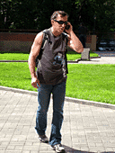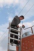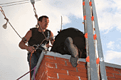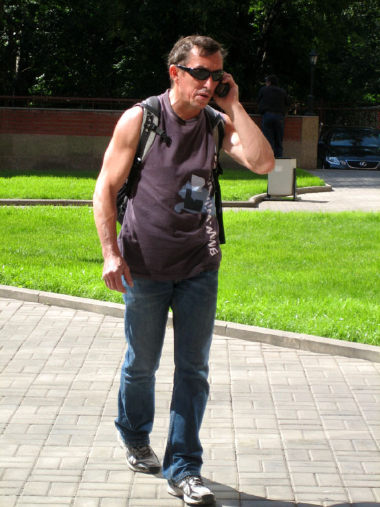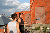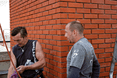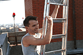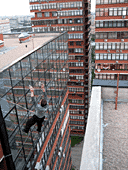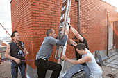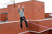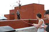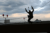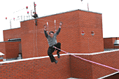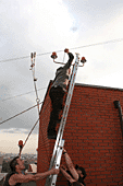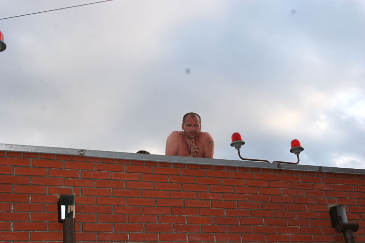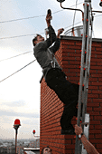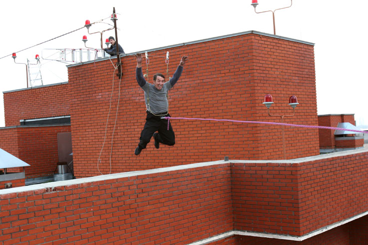 Сказать, что я был поражен – это все равно, что ничего не сказать. Не знаю как у вас, а у меня при слове паркурщик встает перед глазами образ атлета, способного запросто скрутить сальто, динамично взлететь по стене и т.д. А кто пришел к нам на крышу? Два мужика с пивными животами и лицами давно не знавшими бритвы. Цитирую Татьяну: «У меня такое ощущение, что он перед этим 3 дня для храбрости пил и сейчас в жутком похмелье». Едва сдерживая улыбку, я стал следить за происходящим. Мужика нарядили в беседку, одели в штаны и отправили проявлять чудеса мужества. Тут-то у него и вышла осечка. Доблестно забравшись на стартовую лестницу и даже пристегнувшись страховочным карабинами, наш герой вдруг пошел на попятную. Словно подкошенный он упал на колени и стал что-то невнятно бормотать. «Что это? Как такое возможно с каскадером? Кто будет прыгать? Может я?» - вереницей понеслись мысли, но мечтам не суждено было сбыться. Не долго думая, НикВас принял наиболее верное решение – он решил прыгать сам. Далее события развивались по классической схеме: