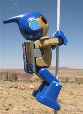 ...Посмотрите на крошку Bunny! Робот все лезет и лезет вверх, болтаясь на веревке в Большом Каньоне в Колорадо! Восхождение на высоту 530 метров (1,740 футов), заняло у Кролика 7 часов (а точнее 6 часов 46 минут), на паре японских батареек от компании Panasonic! Механический кролик Evolta имеющий длину 17 сантиметров, и вес 130 грамм, снабжен новыми батарейками от фирмы Panasonic, работающими на 20% дольше конкурентов - Duracell и Energizer. Восхождение Эволты занесено в Книгу Рекордов Гиннеса. Про похождения кролика более подробно написано тут и тут. (MedunInfo, 03.06.2008)