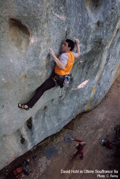 39-ти летний швейцарский скалолаз Дэвид Хол (David Hohl) совершил первопрохождение, по его словам, 100% естественного маршрута Ultime Souffrance, который расположен в районе Saint Loup (Vaud, Швейцария)! Маршрут Ultime Souffrance, является вариантом маршрута Non a la bombe, 8c+ с болдеринговым стартом сложности 8А. Дэвид работал над прохождением маршрута в течении 4-х лет. Это уже вторая 9a Дэвида, в 2002 году он прошел Bain de Sang (Король Бедноты), 9а, видео на котором, можно посмотреть здесь (12 Mb). источник>>. (MedunInfo, 04.10.2008)