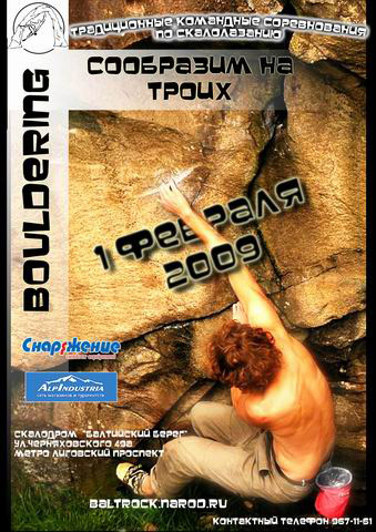 1-го февраля 2009 г. на скалодроме ГОУ "Балтийский берег" С-Петербург ул.Черняховского 49-а пройдут командные соревнования по боулдерингу "Сообразим на троих". Подробная информация и регистрация на сайте baltrock.narod.ru