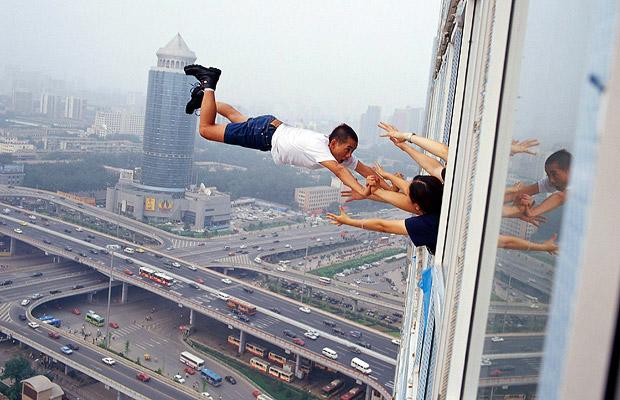 …Китайский фотохудожник Ли Вей (Li Wei) живёт в Пекине и создаёт свои фотографии используя зеркала, тончайшие невидимые тросы и собственные акробатические навыки. Его занятие можно отнести к разряду тех, о которых обычно говорят: не пытайтесь повторить. Действительно, кровь стынет в жилах, когда ты видишь на фото человека, который висит на высоте нескольких сотен метров над землёй и единственное, что его держит это крепкие руки его товарищей... Сайт автора. источник>>. (MedunInfo, 05.03.2009)