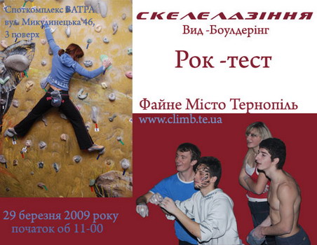 29 марта 2009 года на скалолазном тренажере Ватра (г. Тернополь), будут проходить соревнования по болдерингу "Файне Місто Тернопіль" («Прекрасный город Тернополь»). Соревнования будут проводится в стиле Рок-Теста (фестиваля) + финал будет первым этапом серии соревнований Западного Сектора (неофициальной ассоциации скалолазов Западной Украины, подробнее, здесь (на украинском языке)). Регистрация участников с 10-00 до 11-00. Старт с 11-00. Более подробно будет сообщено дополнительно. источник>>.