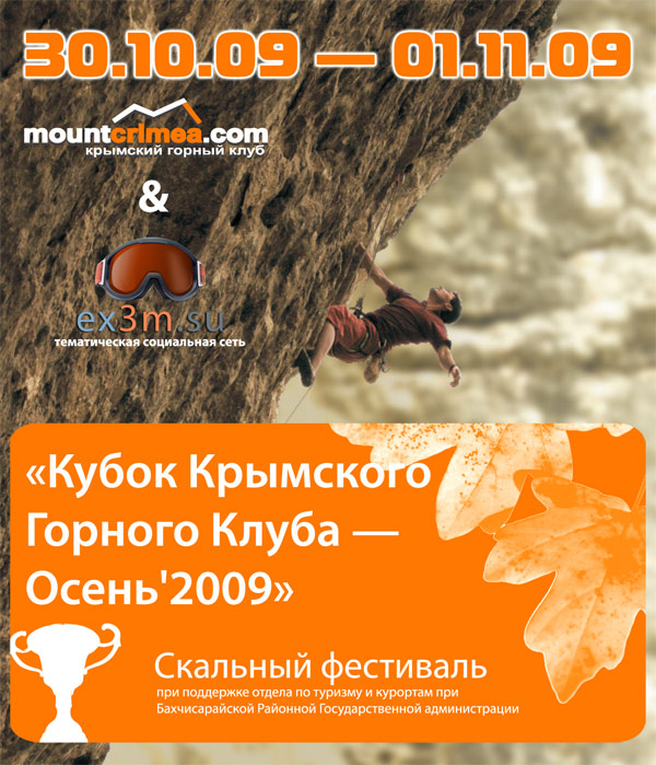 18 октября 2009 г. Секция альпинизма и скалолазания МГТУ совместно с ФАиС Москвы проводит традиционные соревнования по скалолазанию "Осенние старты". Вид - скорость. Начало регистрации в 10:00. Положение будет опубликовано в ближайшее время источник>> (tbr, 30.09.2009)