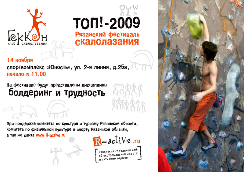 Чемпионат проводится на скалодроме школы № 11 7-8 ноября 2009 г, по адресу: г.Смоленск, Пр.Строителей д.9, в 2-х видах: боулдеринг и скорость Положение>> (Сергей Калентеенков, 19.10.2009)