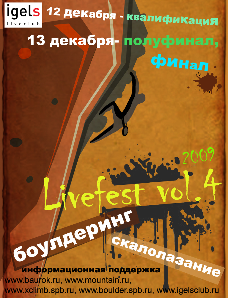 30 декабря с 18.30 на скалодроме Igels пройдет "Новогодний мастер-класс" - лучшие спортсмены (примерно по 10 мальчиков и девочек) придумывают по одной трассе, затем все пробуем пролезть, + в классе "любители" 5-7 несложных трасс. Для желающих участвовать: вход в зал как обычно + 200 руб "конфетный взнос", также можно приносить конфеты и прочие вкусности с собой. С 20.30 - скало-пати, обсуждаем итоги уходящего года и просто отдыхаем и общаемся. P.S. первые 15 лучших мальчиков и 10 девочек по результатам livefest, желающие участвовать, свяжитесь, пожалуйста, с Костей Савельевым по тел. +7 921 7517093 (KoS, 28.12.2009)