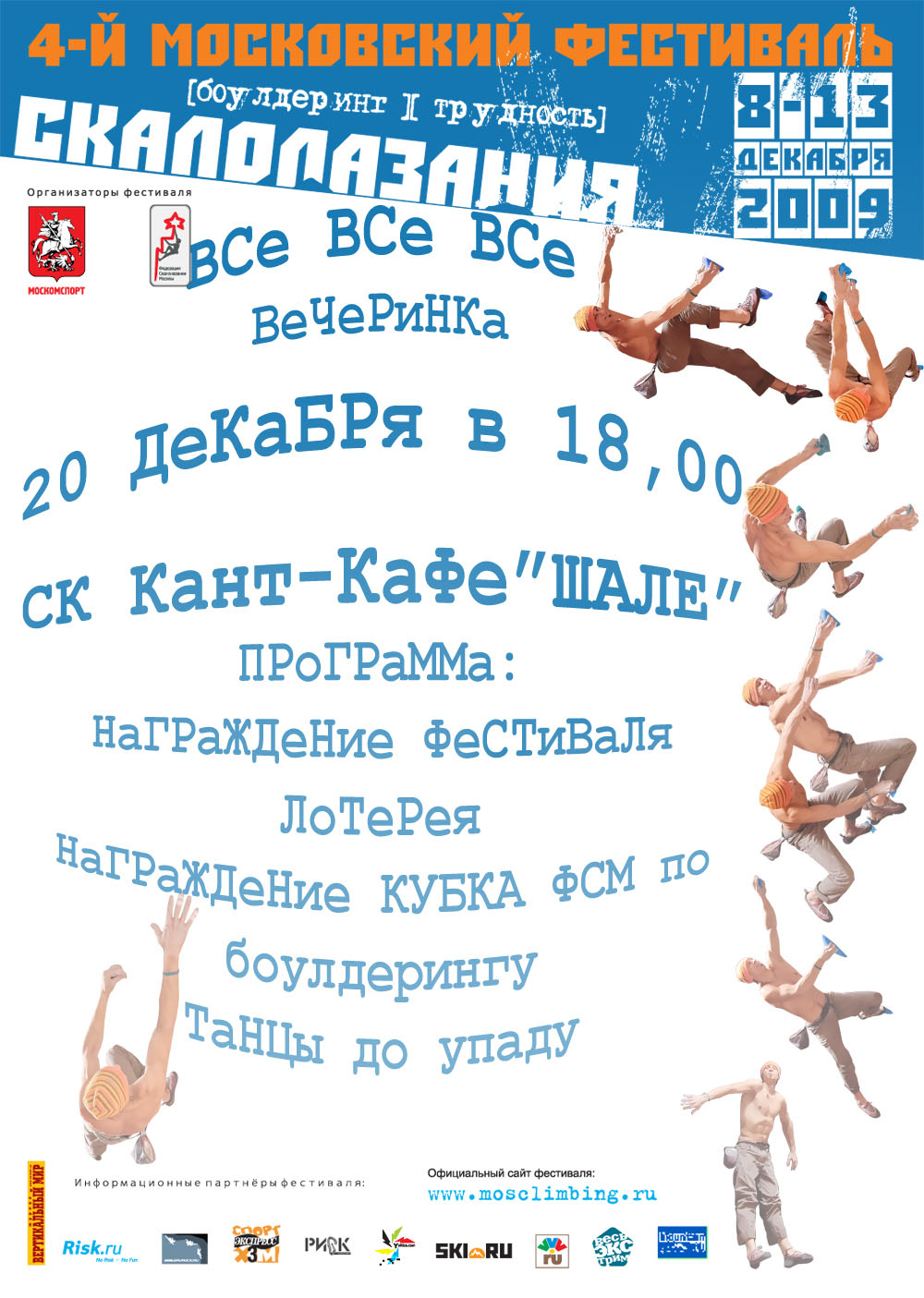20 декабря в 18:00 в СК "Кант" - Кафе "Шале" состоится награждение победителей 4-ого Московского Фестиваля скалолазания. В программе вечера: награждение, лотерея, награждение Кубка ФСМ по боулдерингу и танцы до упаду! (Ракицкая Анна, 18.12.2009)