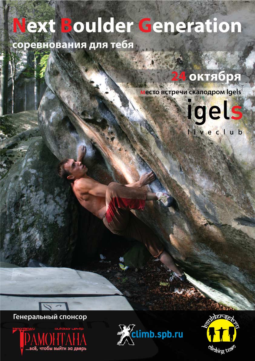 24 октября на скалодроме Игелс прошли крупнейшие соревнования Next Boulder Generation. Всего в соревнованиях участвовало около 150 любителей скалолазания, от начинающих до финалистов Кубка города. Спонсоры соревнований - магазин Трамонтана и скалодром Игелс. Итоговый протокол