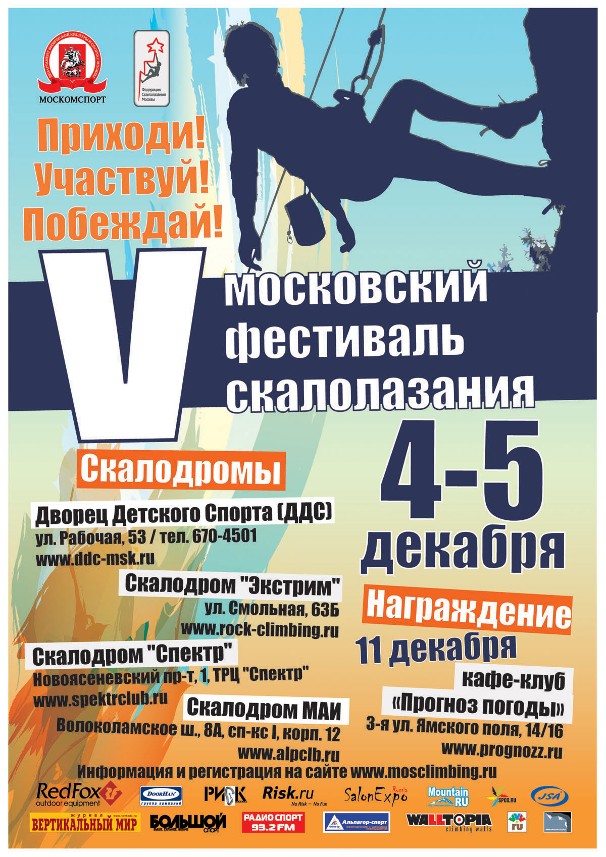 4-ого - 5-ого декабря на четырех скалодромах Москвы (ДДС, "Спектр", МАИ, "Экстрим") пройдет Московский Фестиваль Скалолазания. Приходи! Участвуй! Побеждай!