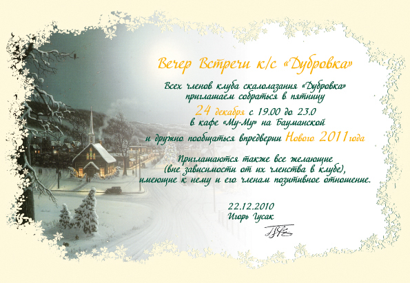 Членов клуба к/с «Дубровка» приглашаем в пятницу 24 декабря с 19.00 до 23.00 в кафе «Му-Му» на Бауманской. Приглашаются также ВСЕ желающие (вне зависимости от их членства в клубе), имеющие к нему и его членам позитивное отношение далее>> (Густав, 22.12.2010)