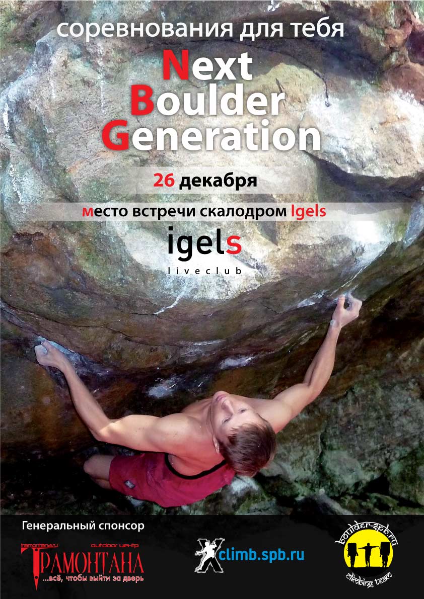 26 декабря на скалодроме Игелс прошли крупнейшие соревнования для всех желающих Next Boulder Generation. Всего в соревнованиях участвовало около 150 любителей скалолазания, от начинающих до призёров Кубка города. Спонсоры соревнований - магазин Трамонтана, фирма Satila и скалодром Игелс. Информационные спонсоры - xclimb.spb.ru и boulder-spb.ru