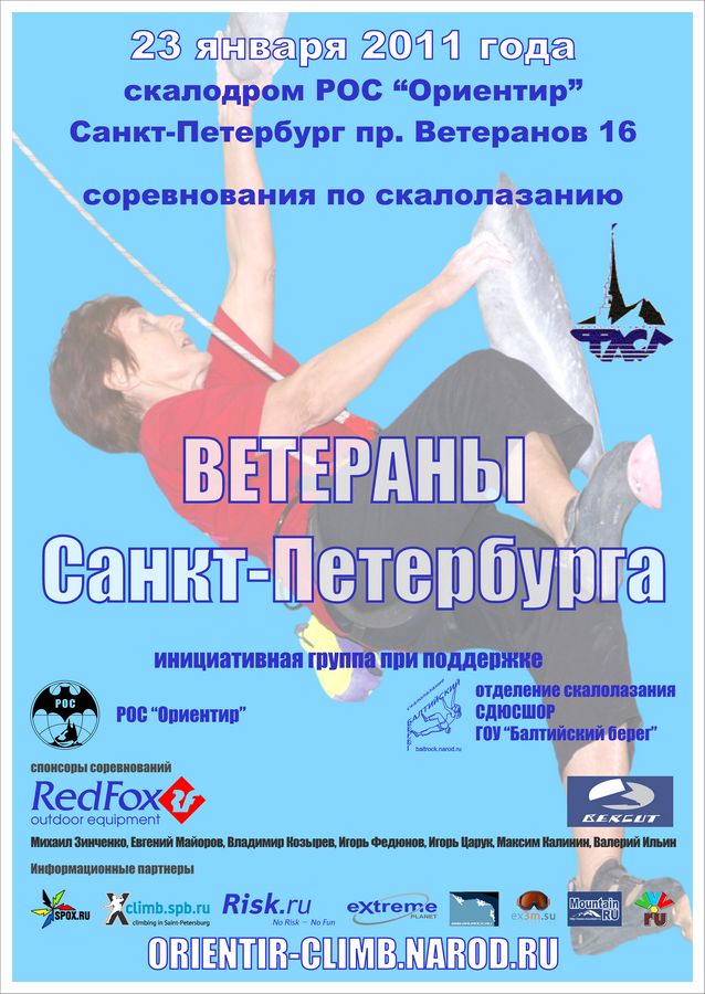 23 января 2011 года на скалодроме РОС "Ориентир" по адресу: Санкт-Петербург пр. Ветеранов, 16. состоятся соревнования по скалолазанию "Ветераны Санкт-Петербурга" 2011 г.