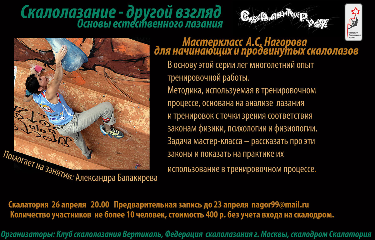 26 апреля в 20:00 на скалодроме "Скалатория" пройдет Мастер-класс А.С. Нагорова "Скалолазание - другой взгляд". Предварительная запись до 21 апреля. Количество участников - не более 10 человек. Стоимость участия 400 р. + билет на скалодром далее>> (Александра Балакирева, 19.04.11)