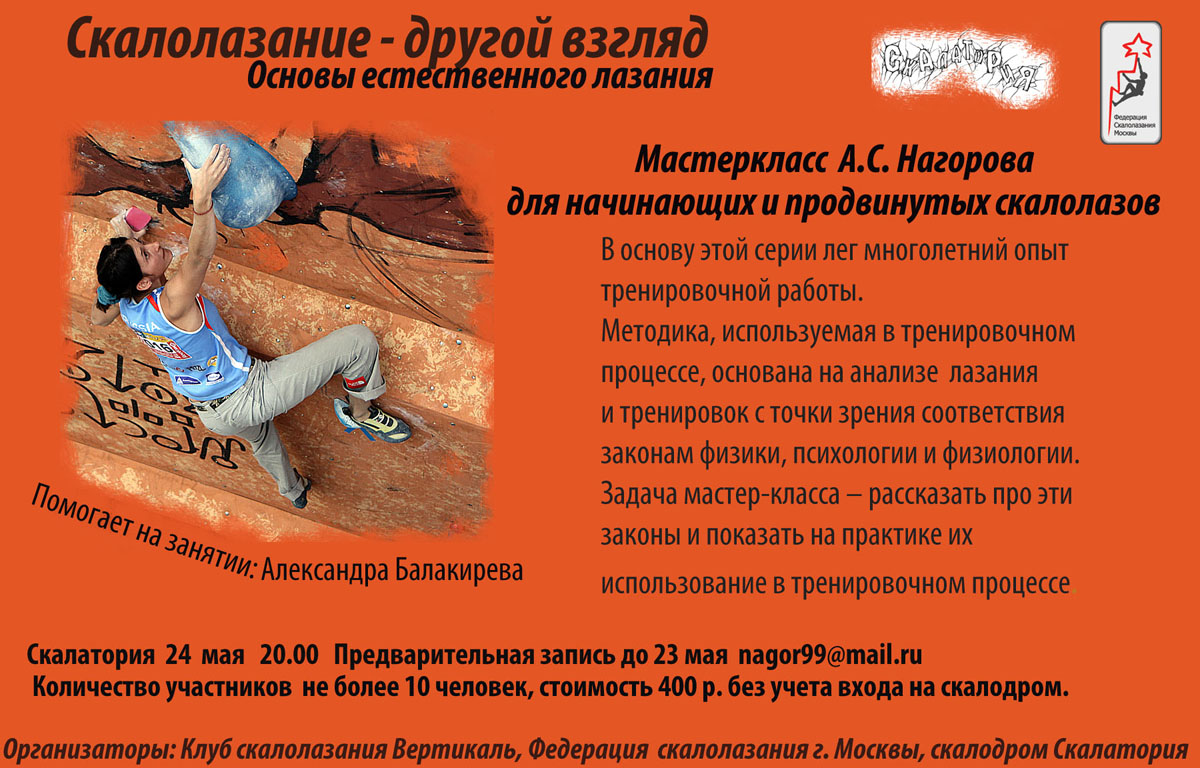 Организаторы мастеркласса: Клуб скалолазания Вертикаль, скалодром Скалатория, Федерация скалолазания города Москвы. Отчет о предыдущем мастер-классе здесь>> (Александра Балакирева, 19.05.11)