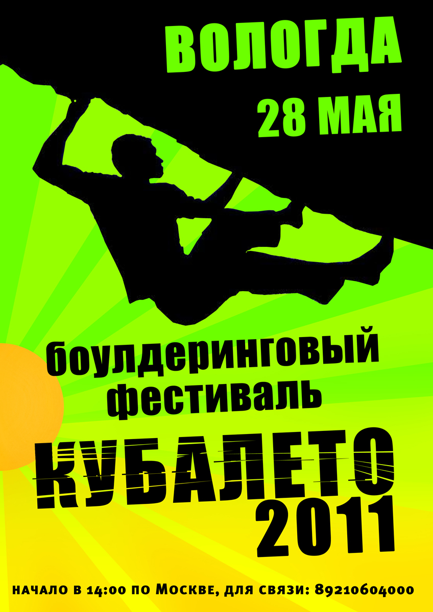 В субботу, в 14 часов пополудни в Вологде пройдёт фестиваль скалолазания в виде боулдеринг. Участникам будет предложено около двух десятков трасс под открытым воздухом, в центральном парке Вологды. Сэт длится 2 часа, если участников окажется больше - время сэта продлится. Победителей ожидают призы и подарки:)