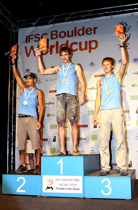 Такого наверное еще не было за всю историю соревновательного болдерингового скалолазания! 20 августа, в Олимпийском Парке города Мюнхена (Германия), завершился восьмой, финальный этап Кубка Мира-2011 по болдерингу. У мужчин, российские спортсмены с легкостью и запасом, просто "разорвали" всех иностранцев! В результате, мужской подиум был полностью российским! Пятым стал Михаил Шалагин (Украина, Одесса-Киев), который разделил это место с Яной Черешневой (Москва)! Результаты финала: