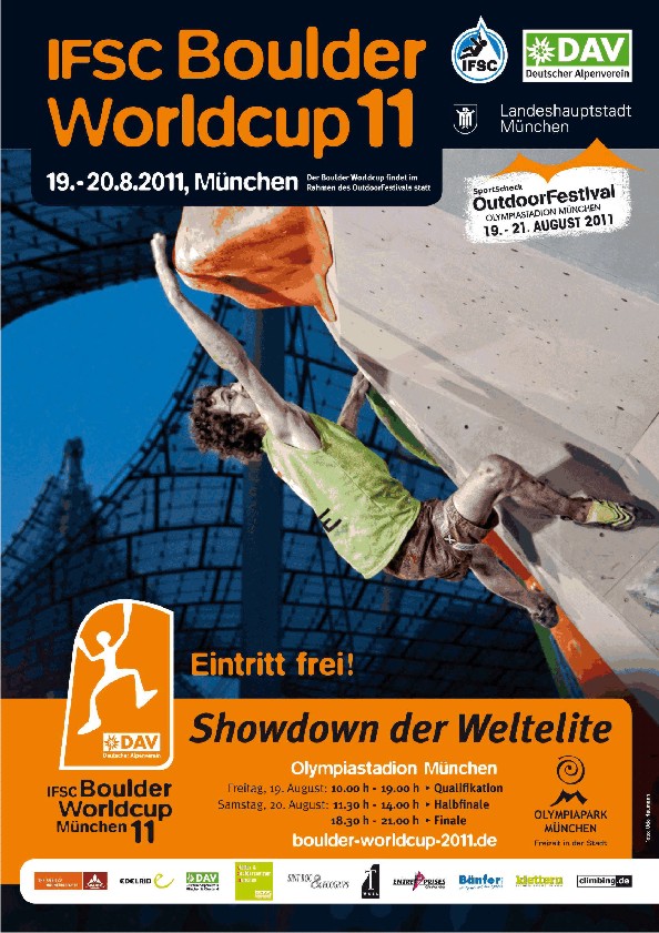 19-20 августа, в Олимпийском Парке города Мюнхена (Германия), состоится восьмой, финальный этап Кубка Мира-2011 по болдерингу. Как обычно, соревнования пройдут в рамках грандиозного outdoor-фестиваля для широкой публики. И если результаты данных конкретных соревнований как всегда, не достаточно предсказуемы, то победителя общего зачета Кубка Мира-2011 у мужчин, можно практически с уверенностью назвать, это австриец Килиан Фишхубер (Kilian Fischhuber), который по баллам, полученным от выступлений, практически недосягаем для своего ближайшего соперника, россиянина Дмитрия Шарафутдинова, занимающего по кубковому рейтингу 2-е место. У девушек ситуация по-интереснее, борьба за Большой Кубок Мира - 2011, развернется между австрийкой Анной Штор (Anna Stohr) и японкой Акио Ногучи (Akiyo Noguchi), у которых разрыв в рейтинговых баллах минимален. Однако, не будем гадать и посмотрим что покажут соревнования! В соревнованиях примут участие восемь спортсменов из России и двое из Украины. Полностью стартовый протокол, можно посмотреть здесь. Положение соревнований, можно прочитать здесь (на английском языке). Текстовые результаты онлайн будут показаны на сайте IFSС. Онлайн видео-трансляция финала Кубка Мира-2011 по болдеригу, ожидается здесь. Более подробную информацию о соревнованиях и месте их проведения, можно получить на официальном сайте. Болеем за наших! (MedunInfo, 17.08.11)
