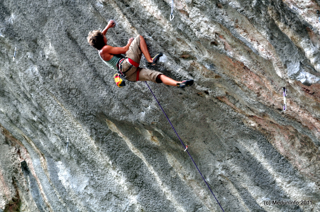 Легенда мирового скалолазания, Чемпионка Мира и Европы, бельгийка Мюриэль Саркани (Muriel Sarkany), в этом году очень серьезно занялась отработкой и прохождением новых маршрутов на скалах, в одном из самых «сложных» районов Европы, Deverse (другое название, Pupuse Surplomb, долина Gorges du Loup, Франция, недалеко от Ниццы). После своего недавнего прохождения маршрута Hot Chili X, сложности 8c, она прошла невероятно длинный Quossai les Maux de la Fin, также сложности 8c, что позволило ей занять вторую строчку в международном женском рейтинге в лазании на трудность сайта 8a.nu! Напомним, что в августе 2011 года, эти же маршруты, (Hot Chili X и Quossai les Maux de la Fin), прошли Яна Черешнева (Москва) и финалист ЧМ 2011 года, Евгений Овчинников (Красноярск). На фото, Мюриэль Саркани на маршруте Hot Chilli X, 8c, (c) MedunInfo, 2011. источник>>. (MedunInfo, 18.09.11)