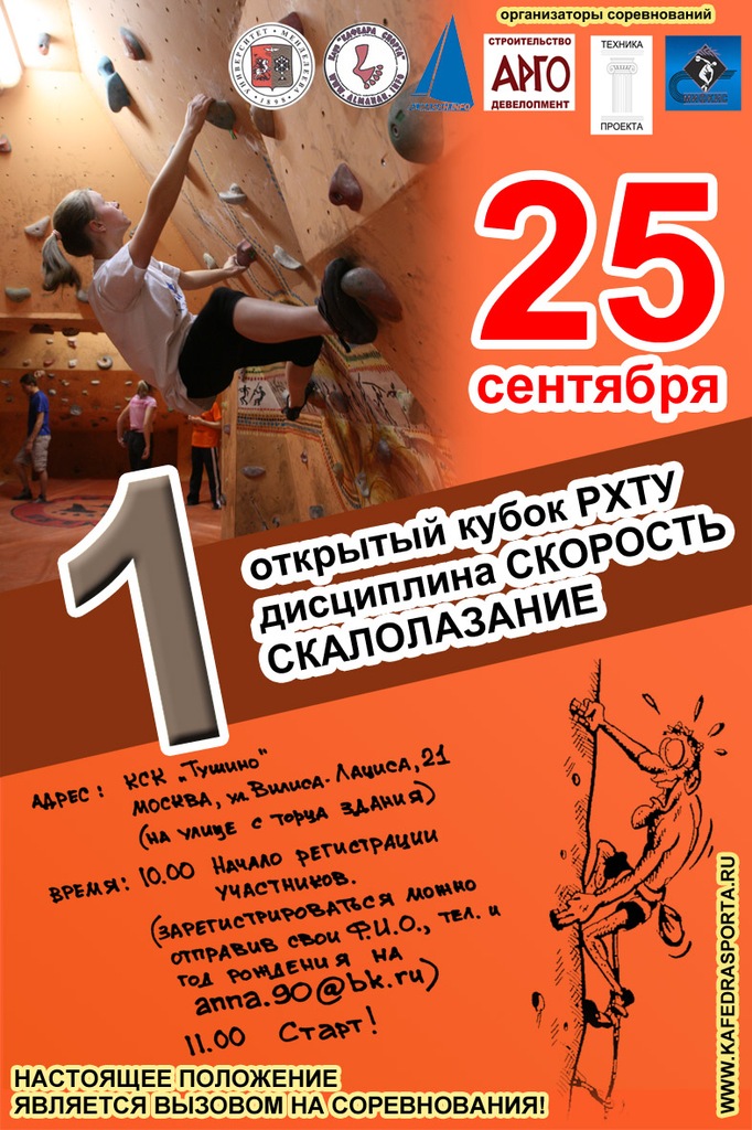 25 сентября 2011 года в РХТУ им. Д.И.Менделеева клуб «Кафедра Спорта» провел I открытый кубок в соревновании по скалолазанию в дисциплине «скорость». В нём приняли участие первокурсники, старшекурсники посещающие секцию далее>> (Сергей Курбатов, 26.09.11)