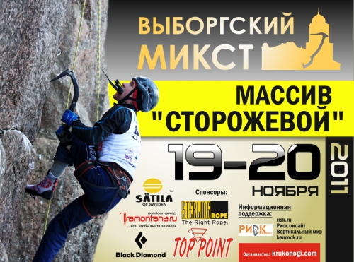 И снова здравствуйте! :) Напоминаем всем заинтересованным и сочувствующим, что 10-й юбилейный Выборгский Микст состоится 19-20 ноября на скальном массиве "Сторожевой" под г. Светогорском далее>> (Максим Торганов, 05.11.11)