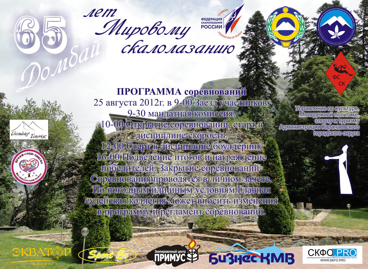 Соревнования проводятся на естественном скальном массиве на территории поселка Домбай 25 - 26 августа 2012 г. в дисциплинах: лазание на скорость и боулдеринг Положение>> (kich, 17.08.12)