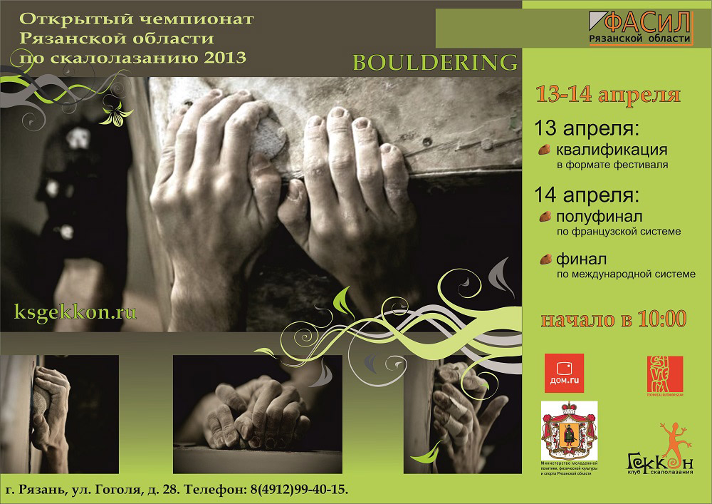 Соревнования проводятся 13-14 апреля 2013г. на скалодроме спорт-клуба Рязанского учебного комбината (ул.Гоголя, д.28). Соревнования проводятся среди мужчин и женщин в дисциплине болдеринг Положение>> (Юрий Воинов, 04.04.13)