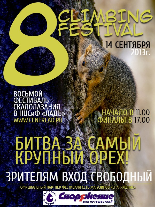 Фестиваль проводится в период с 15.09 по 22.12 2013 года на скалодроме RockZona, по адресу пр. Андропова 22. К участию в соревнованиях допускаются все желающие, без ограничения по квалификации и возрасту далее>> (Густав, 09.09.13)