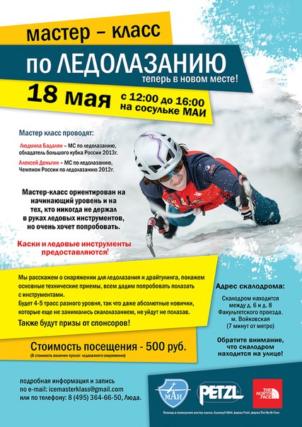 18 мая на сосульке МАИ пройдет Мастер-класс по ледолазанию. Мастер-класс проводят Людмила Бадалян и Алексей Деньгин далее>> (Людмила Бадалян, 23.04.14)