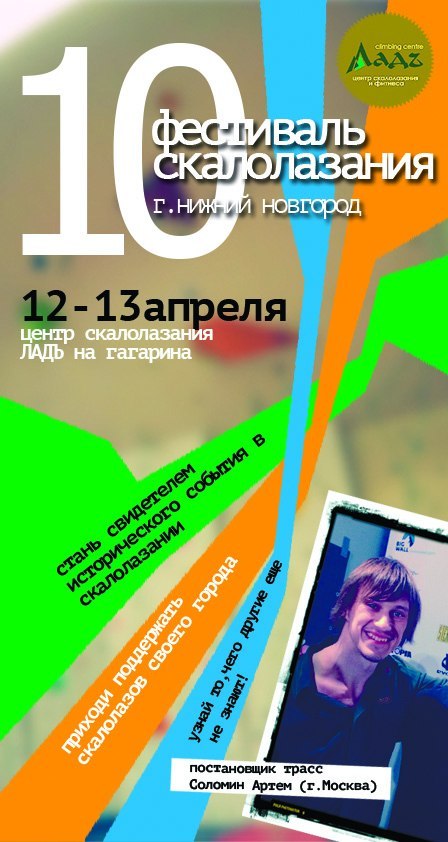 Вот уже и "первый юбилейный" фестиваль на подходе, да еще и в День космонавтики! Приходите к нам 12 и 13 апреля лазать, смотреть, висеть, болеть, общаться, открывать для себя что-то новое! Традиционно пройдут соревнования по боулдерингу и трудности по потолкам