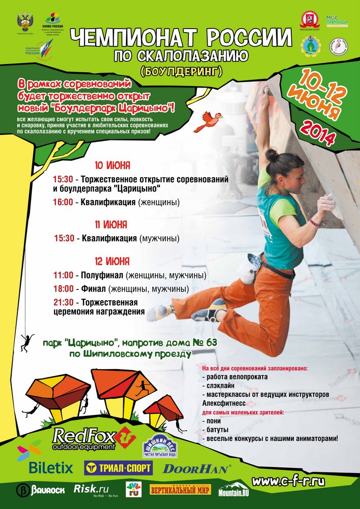 В третий раз за последние четыре года лучшие боулдерингисты страны соберутся в Москве. Но в качестве места проведения выбраны «грибы», только что построенные в природно-историческом парке «Царицыно» далее>> (Алексей Сергунин, 29.05.14)