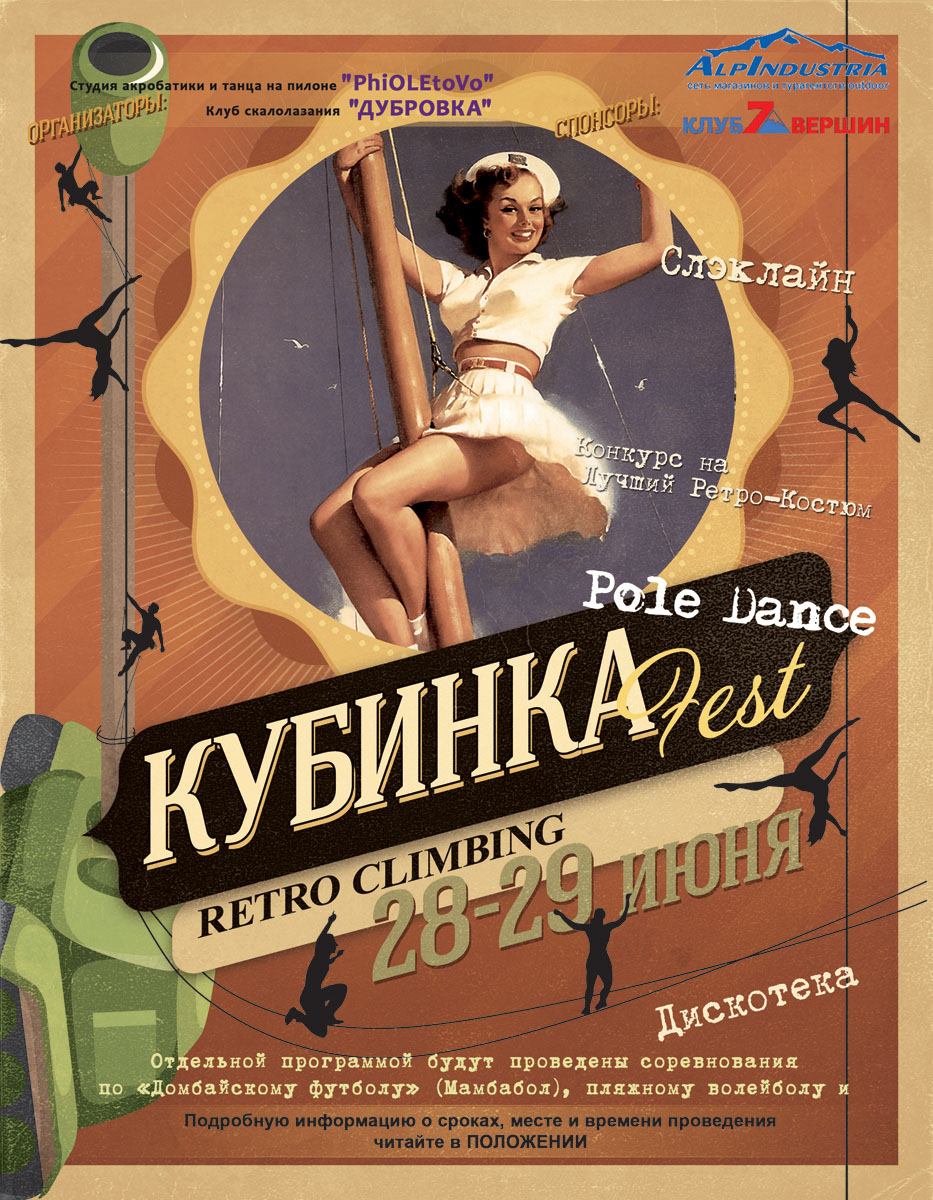 28-29 июня на частном уличном скалодроме (12м высоты), в лесном масиве под г. Кубинка пройдет скалалазно - экстримный фестиваль. В программе - лазание (6 трасс от 6а до 7а+/7б), слеклайн, полиденс, ропджамп, домбайский футбол, пляжный волейбол, конкурс лазательных ретрокостюмов и др. Будет организовано: детская площадка, места под палатки, кострища, мангалы для шашлыков. Возможна организация трансфера от ж.д. станции до места проведения фестиваля.