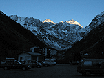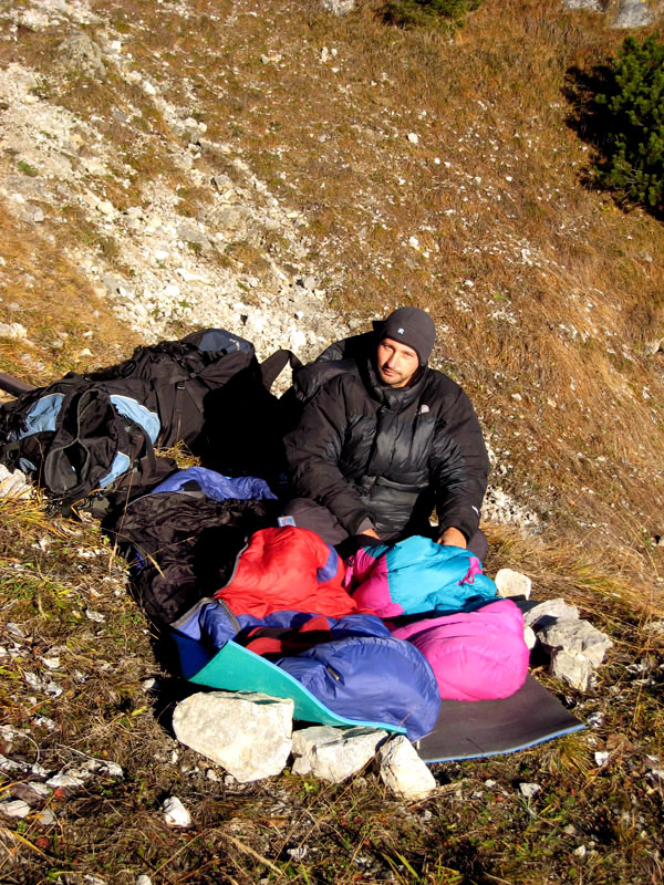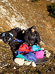 Далее мы разделились – я пошёл исследовать верхнюю часть ущелья на предмет переночевать, а Паша пошёл в соседнее ущелье, чтобы найти-таки наши маршруты. Я ничего не нашёл, только выворотил себе на плечо камень от чего плечо болело всю оставшуюся поездку и мешало лазать, а также позволяло списывать на него всё свое неумение лазать микстовые и ледовые маршруты :-). Пашин заход оказался удачнее моего – во-первых плечо осталось целым а во-вторых он нашёл маршруты. Тем временем стемнело и надо было решать, что делать дальше. Спальники и пенки были в достаточном количестве, была ещё палатка, но так как на горизонте туч не было, а Паша был настойчив :-), палатку ставить не стали. По небу летали спутники, метеоры, самолёты и всякая мелкая пернатая сволочь, в кустах шароёбились суслики. Мы лежали рядом и разговаривали обо всём начиная с политической обстановки в Бирме и заканчивая особенностями реализации алгоритма split horizon в маршрутизаторах Cisco. Всё утро во мне боролись желание спать и сходить в туалет, как обычно желание пойти в туалет победило.