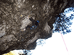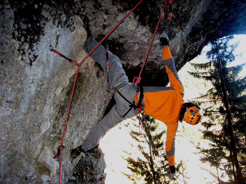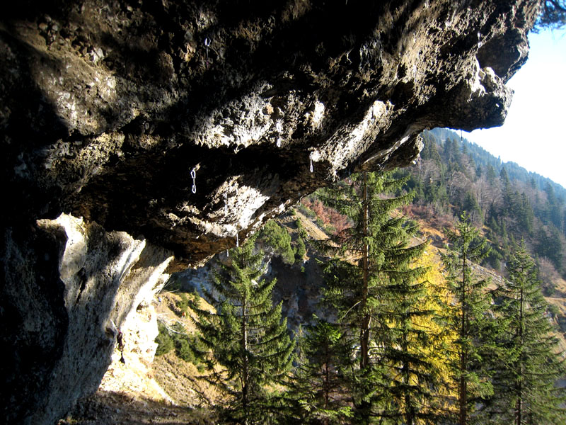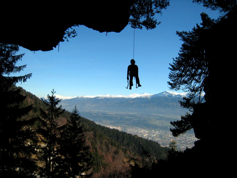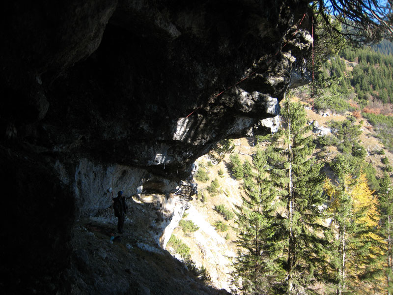 «Поднимайся или ты собираешься жить вечно» - обратился я к Паше. Позавтракали, засунули рюкзаки в микропещеру, хотя в Австрии ни кто ни чего не воруют, но так спокойнее (по принципу «Аллах, конечно, акбар, но ишака привязывать не забывай») и пошли к маршрутам. Мои надежды на M5 оказались тщетными – по нему текла вода, пришлось лезть M7, который по некоторым гайдбукам проходил, как M9. Вылез его несколько раз с зависами и выщёлкиванием.