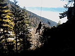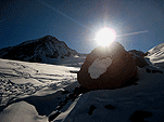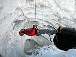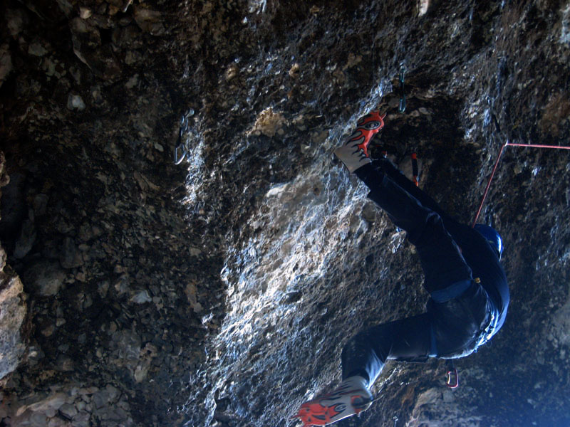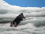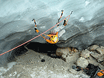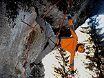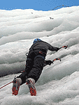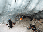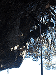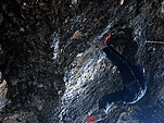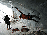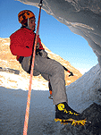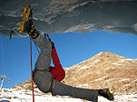На этот раз у стенок ледолазов не было (то ли из-за того, что был понедельник, то ли по какой другой причине), надо заметить, что не было их весь день. Полез по своей любимой правой стенке в какой-то момент времени выбрал кучу верёвки и пытаясь дотянуться до оттяжки вышел выше места забивания молотка, о чем молоток не замедлил мне сообщить, вылетев из кармана, по словам Паши, летел я эффектно. Вишу я метрах в двух от стенки с одним молотком в руках, вотрой торчит во льду выше меня кое-как по верёвке долез до верхней оттяжки, потом, воткнув оставшийся молоток, дотянулся до застрявшего и вылез-таки трассу. Паша мочил свой болдеринг на потолке. Устав лазать, пошли на солнце варить сосиски.