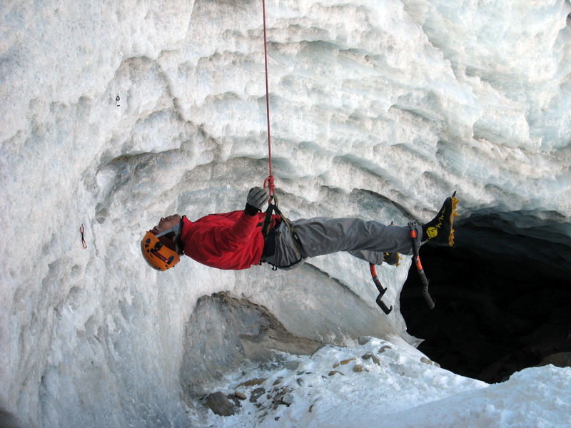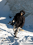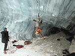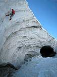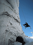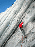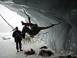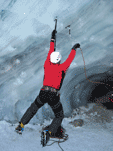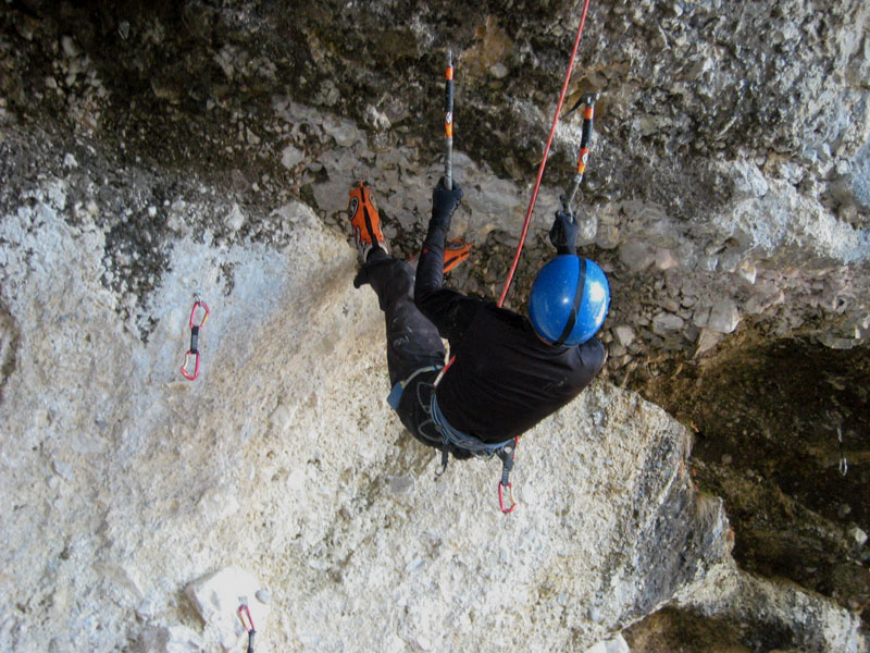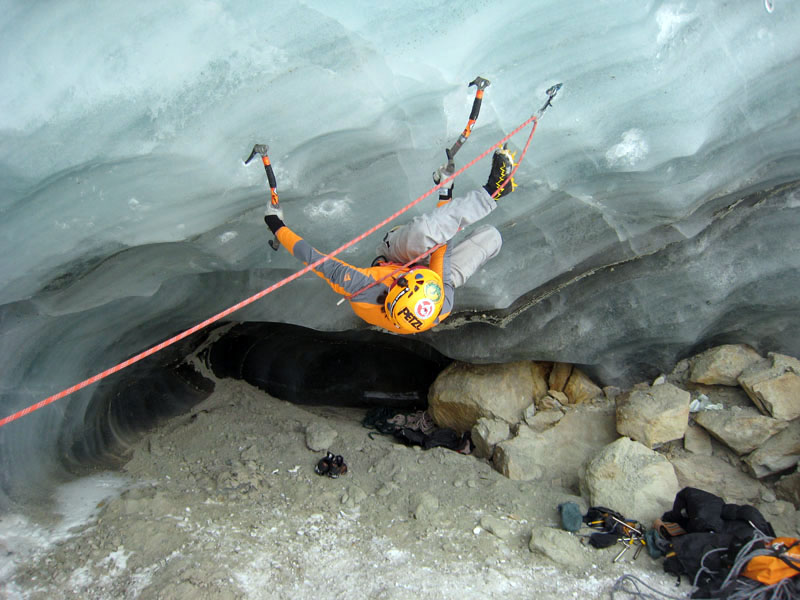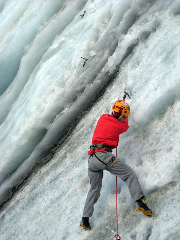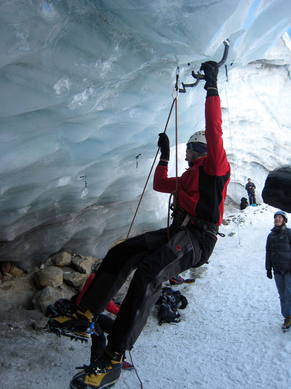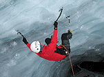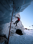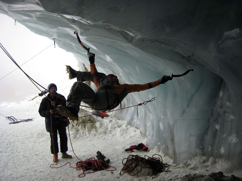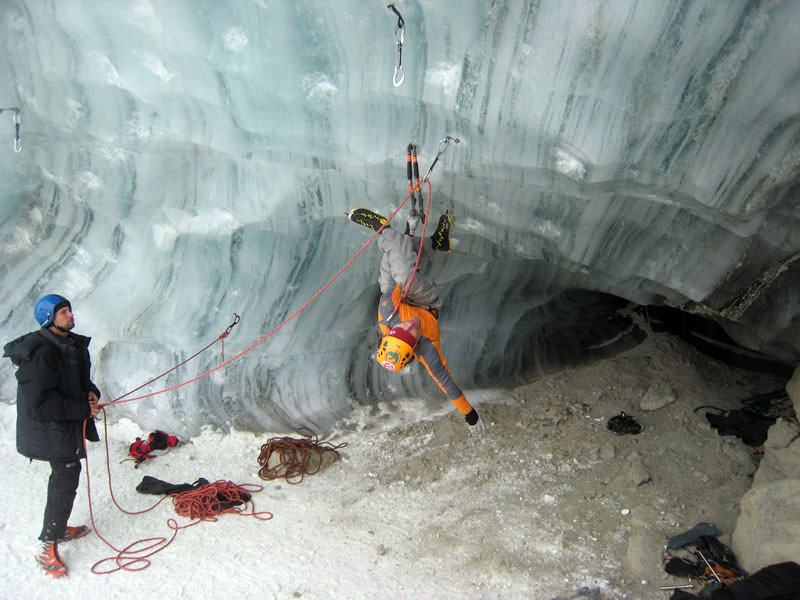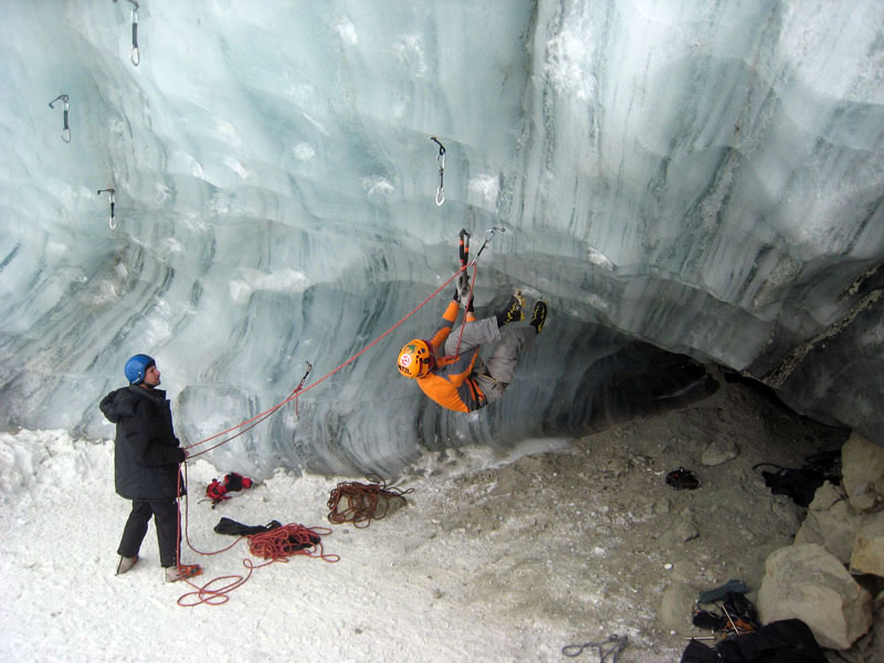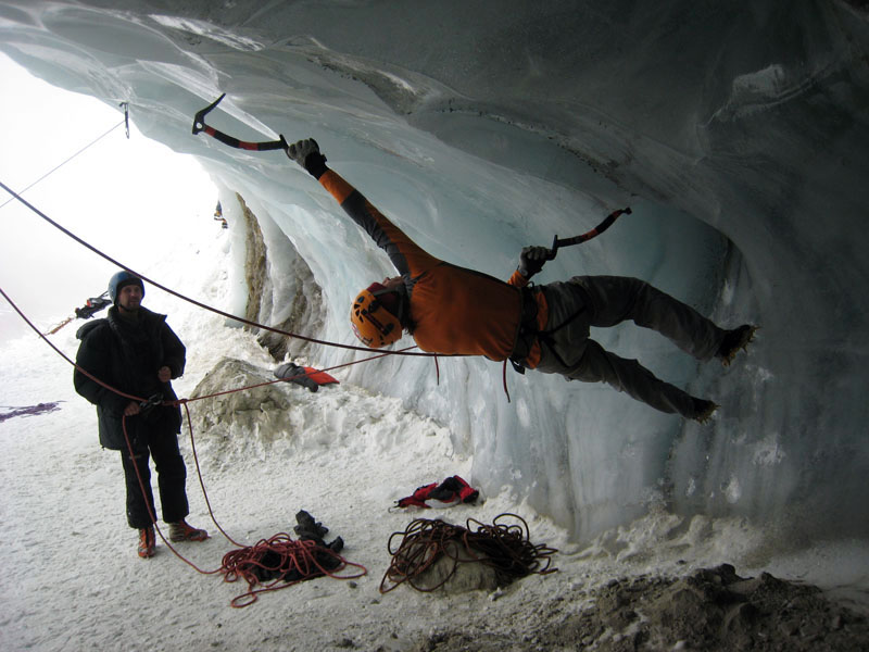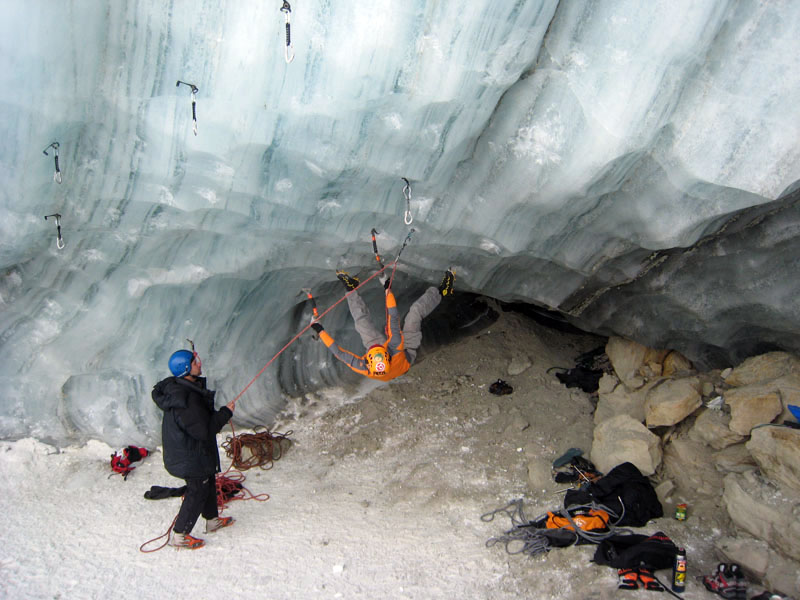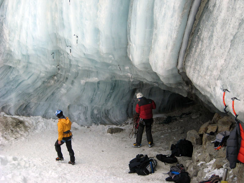 Спустились к леднику на леднике четыре маршрута (два начинаются в ледовом гроте и после выхода на вертикальную стену соединяются, один слева от грота и один справа). Оборудованы маршруты стационарными оттяжками, повешенными на ледобуры. Сверху висит плакат, извещающий о том, что спонсором пробивки является фирма austrialpin. Слева от пробитых маршрутов стенка с положительным уклоном градусов 70-80, где можно лазать со своими ледобурами. Трасса слева от грота мне не понравилась – лазающая там пара австрийцев постоянно обрушивала друг на друга глыбы льда и в итоге лезущий метким броском молотка распорол-таки пуховку страхующему – зрелище было феерическое. Надо заметить, что при падении чего-либо сверху вместо «камень!» немецко говорящие товарищи орут «achtung!». Относиться к этому надо спокойно и не пытаться лягнуть воображаемого пристраивающегося сзади содомита кошкой, так как подавляющее большинство крикунов албанским не владеет и орут так от непонимания основного значения этого слова.