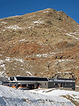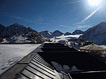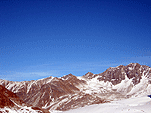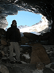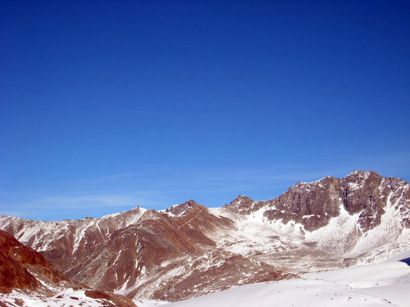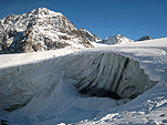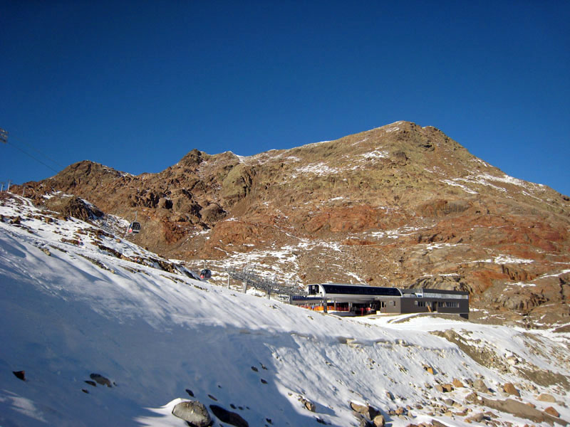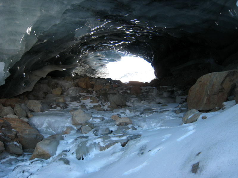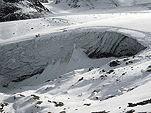 Так за разговорами мы доехали до знака «проезд запрещён» в Миттельберге, проскочив нужный поворот (надо заметить, что в этом месте все проскакивают, а потом разворачиваются), вернулись назад , доехали до вагончиков, едущих по прорубленному в горе тоннелю к горнолыжным трассам. Поднялись, вышли на улицу. Кругом снег, солнце фигачит со страшной силой. Пришлось купить тёмные очки. Вышли на улицу на этот раз в очках и потащились вниз по горнолыжной трассе к предполагаемому месту расположения ледника, вызывая удивление у горнолыжников и сноубордистов. Дошли до нижней станции креселки, увидели ледник. Пройти к леднику можно было двумя способами – либо обойти здание станции и спуститься, либо чуть подняться по трассе и затем также спуститься. Второй вариант был короче, но после того, как на предполагаемой траектории нашего движения завалился сноубордист-неудачник, решили двигаться в обход.