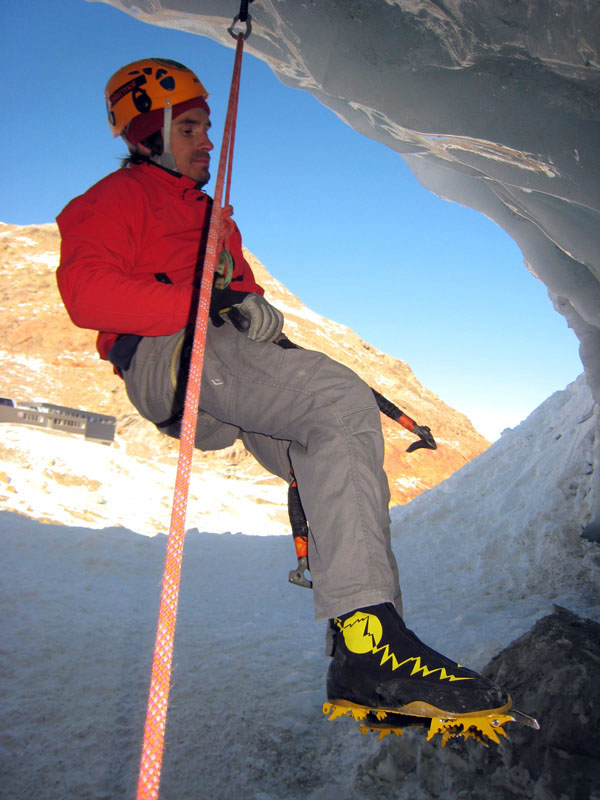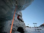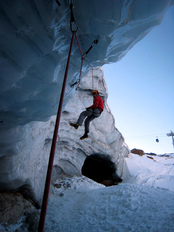 Был там также крутой австрийский перец, которые лазал с вщёлкиванием все нависания достаточно уверенно и без зависов. Судя по одежде, снаряжению и дифирамбам в отношении austrialpin, эта фирма его спонсирует. Молотки у него, в отличие от наших, были острыми и держали везде. Вспомнилась фраза однофамильца нашего американского Костика про то, что у англичан ружья кирпичом не чистят. В итоге я полазал правый от грота маршрут, пролез со своими точками слева от грота и спустился с выкручиванием ледобуров, чем был несказанно горд. Пашка ломился по нависаниям, изображая бесконечные figure four. Так, налазавшись вдосталь пошли обратно. Решили не ломиться в лоб по трассе, а воспользоваться креселкой. Взгромоздились на кресло с рюкзаками и с удивление обнаружили, что кресла подогреваются!