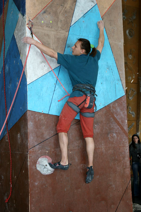 И вот я уже в здании скалодрома. Участников не видно – может они все попрятались? Ан-нет, за одним из поворотов нескончаемой лестницы наверх, наталкиваюсь на бродящего в задумчивости Светополка. Наверное, разрабатывает секретную стратегию выступления в ожидании напарника, но так как стратегия секретная – иду дальше. Открываю дверь и… Эй! Ну где же все? Так: организаторы на месте, Сарапаев С.Б. здесь и даже скалодром. А где толпы участников? Где несметные группы поддержки?.. Спят? Юбилейный Баурок, а они спят.