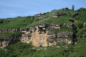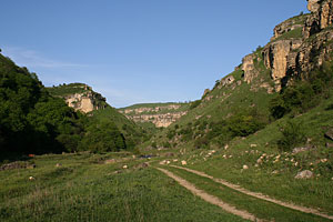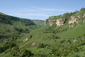 Правая по ходу движения сторона ущелья более крутая, здесь больше высоких скальных выходов,