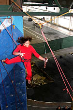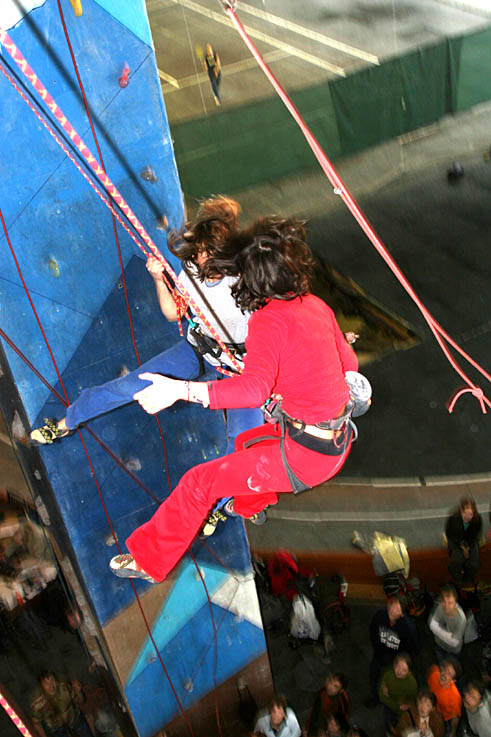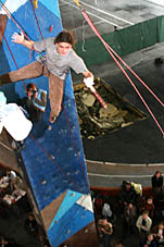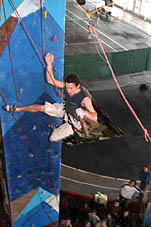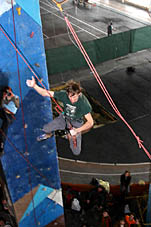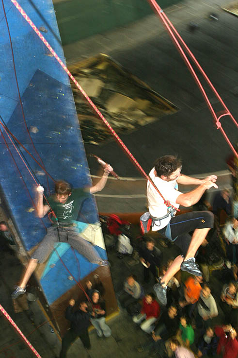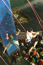 Стоит заметить отдельно, что, вопреки всем злопыхателям, ни один участник соревнований не пострадал (при съемках данного фильма ни одно животное не было убито или покалечено:). При попадании на веревку, рано было впадать в эйфорию, следовало немедленно начать подтягиваться на ней и, остановив маятник, поймать ногами зацепки, после чего следовала незамысловатая 5с+, на которой многие спортсмены, измочаленные вдохновляющим стартом, сдувались, зато другие боролись до конца. При всем при этом не стоило забывать, что речь шла не только о высоте подъема, но и о времени, так что излишне чувствительные товарищи, подолгу неспособные решиться на прыжок, или непривыкшие к шатающейся опоре профи, увы, не попадали в финал.