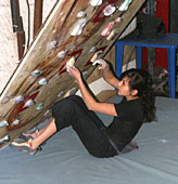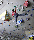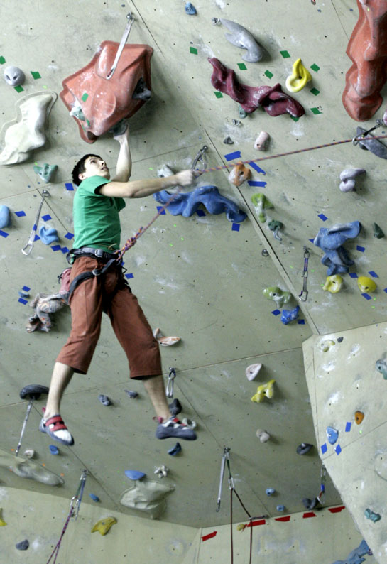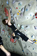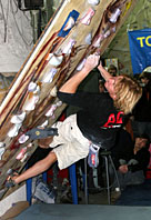 Мужикам, как всегда, повезло гораздо больше. Именно на них Шура Семенов потратил свою неуемную фантазию. Оговоренный рукоход по потолку в итоге превратился в действо, от которого трещали стены, потели пальцы, срывались горла, а накал страстей неоднократно достигал апогея. Мужская трасса начиналась с прыжка да две зацепки, далекие от идеала. На прыжок давалось бесчисленное количество попыток в течение полутора минут. Допрыгнув до зацепок, участник должен был продолжить лезть трассу на одних руках.