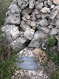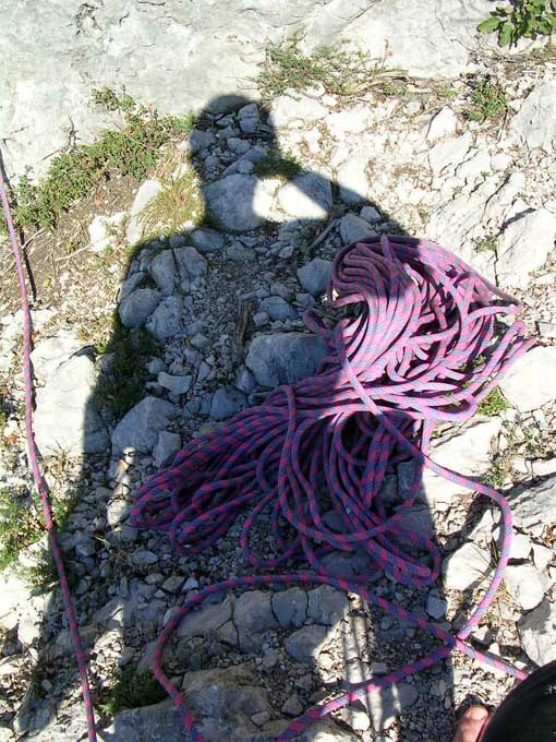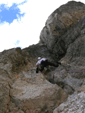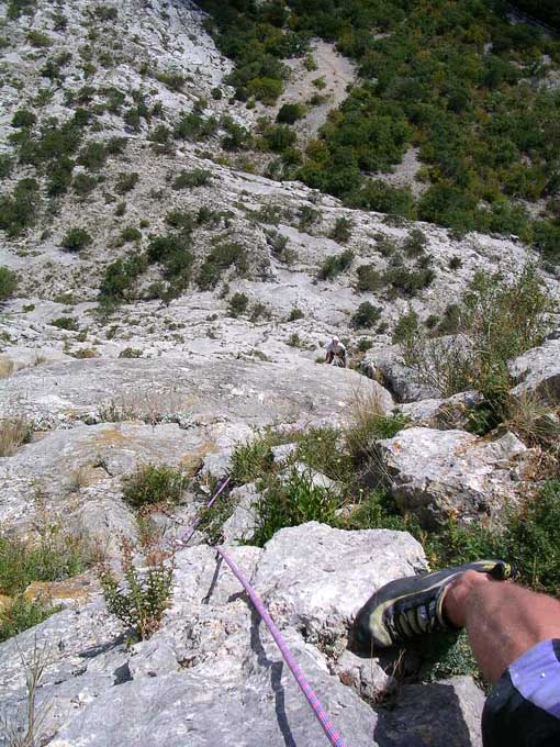 Наконец разглядели раздвоенный пень - первую станцию. Успокоились, одели каски, системы и тапки, Степа пошел. Первая веревка - по полого лежащей раскрошенной плите, есть можевелловые кусты, за которые можно страховаться. Дойдя до пня, Степа с сомнением покачал его рукой и пошел дальше. За первой веревкой - вторая, третья. Лазание несложное, времерами встречаются шлямбура и крючья.