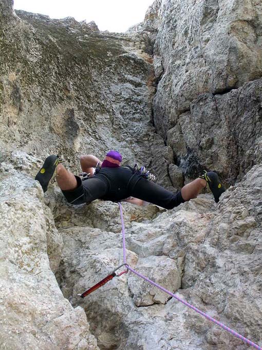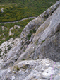Вижу подходящую дырку, сую туда френд. Начинаю трясти его и дергать - как ни странно, держит. Надо же! Плюс ко всему, приходится постоянно осматриваться, искать линию маршрута. Не всегда видно следующий шлямбур или крюк. Описание помогает тоже не всегда - не везде есть характерные детали ландшафта, бросающиеся в глаза.