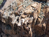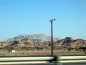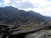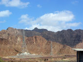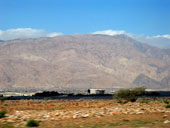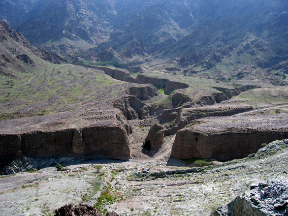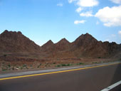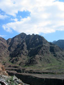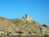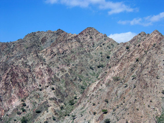 Горы издаля казались заманчивыми. Подъехав поближе, стало ясно, что горы низкие и сильно осыпавшиеся. Но голова и мозг уже работали в режиме радара: неплохая стеночка, жалко метров 6 всего, возле вершины даже чуть нависание, но плохой подход и т.д. Хорошее мини-ущелье искусственного происхождения, в котором идет дорога, но страховать придется с дороги. Выводы о скалолазной перспективности данного района минут через 20 были сделаны не очень утешительные. Ой недаром пробитые маршруты тут ближе к границе Омана.