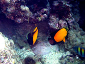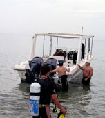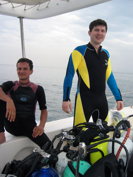 Слегка заправились пивом и решили сегодня не нырять, а просто съездить на рыбалку перед конкретным вечерним шашлыком. Погрузились в лодку и пошли к сайту (место для погружения), выгрузили одного дайвера и инструктора. Поплескавшись возле лодки принялись за рыбалку. Ловят тут с лодок на катушки без всяких поплавков. Сменили четыре места, клева нигде не было. Настроение это особо никому не испортило и мы пошли подбирать дайверов. Я тут уже слегка акклиматизировался и стал дико мерзнуть по малейшему поводу. Солнце село, мы все мокрые, лодка шпарит, ветер дует - замерз слегка в общем. Зацепился в блоке за каркас тента в лодке, ноги в уголке за борт – греюсь.