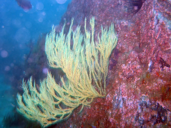 Зачем то стучу пальцем по стеклу глубиномера. Подгребает Олеся, спрашивает какие проблемы ? Сую ей под нос прибор. Она тупо смотрит на него секунд тридцать, потом примерно столько же на свой компьютер. Сует комп мне, вижу что глубина 10 метров. Понятненько, кажется у меня глубиномер в футах показывает, ну да фиг с ним, пора и делом заняться - скалы и живность осмотреть.
