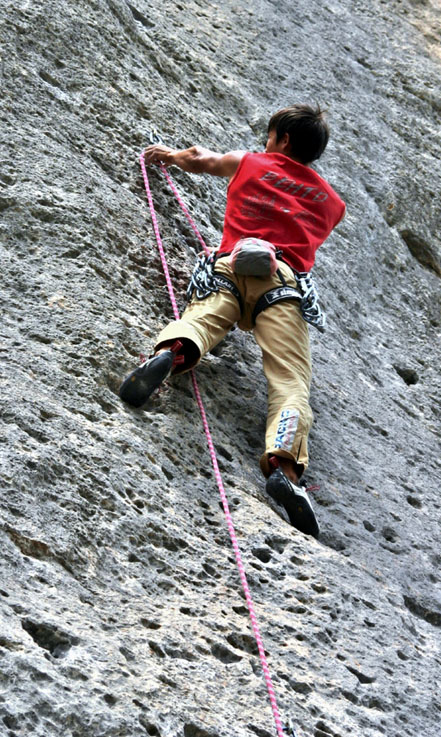 После дня отдыха мы начали лазить более тяжелые трассы: 7с и 7с+, трассы разные - одни по вертикали и мизерам, другие по лоханям и нависанию. Еще через пару дней Рустам пролез первую в этом выезде 8а on- sight с провешиванием - Bourinator, а у меня пока был лучший результат 7а flash. В этом выезде мы тренировали on-sight, поэтому самая сложная трасса, которую пробовал Рустам, была 8в La Chirurgien Du Crepuscule с двумя зависаниями, и 8а у меня без одного начального движения.
