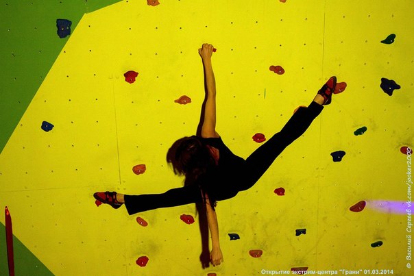 Вертикальная стенка с небольшим карнизом позволяет занимать совсем необученных - зелёных, а отрицание в 30 градусов и потолок добавляют зрелищности на тренировках спортсменов, которые с радостью накинулись на новенькие не засаленные зацепки.